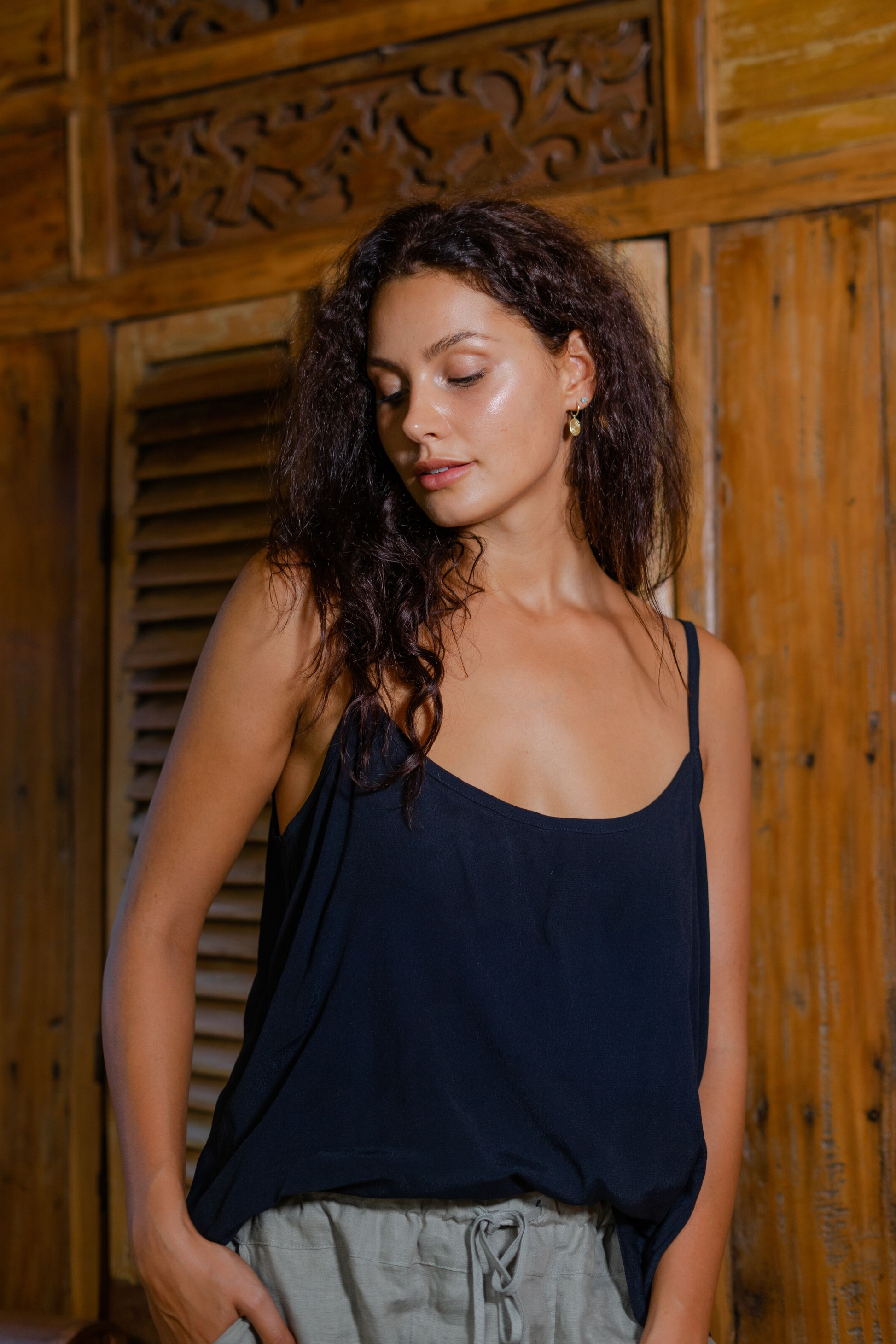 Our Danni black camisole crafted from soft rayon is cut on the bias allowing plenty of room around the tummy and has adjustable straps for that perfect fit.